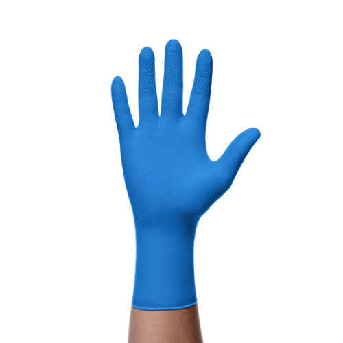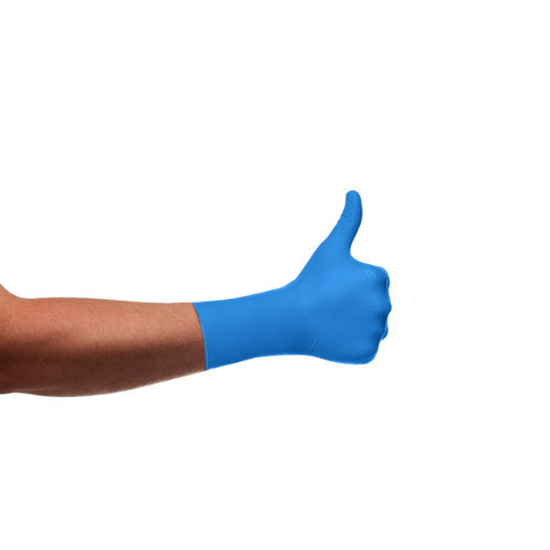 Mănuși Mercator GoGrip Long, 30 cm lungime, albastre, groase, cu textură unică de diamant, din cauciuc nitril fără pudră. Profesional, calitate premium.