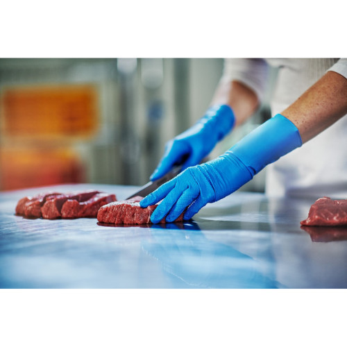 Manșeta extinsă face ca mănușa să fie deosebit de potrivită pentru mediile de lucru în care mâna, Protecția încheieturii mâinii și a antebrațului este de o importanță capitală. Textura 3D cu diamant asigură o prindere stabilă, în timp ce materialul mai gros crește durabilitatea și protecția. Mănușa este recomandată în special în industria alimentară și în timpul proceselor de curățare. ​